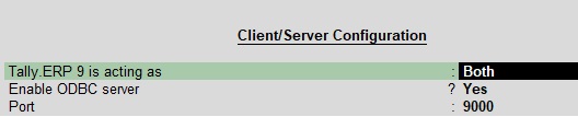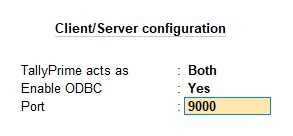 b) For Tally Prime--> Press F1 (Help) --> Settings ---. Connectivity --> Client/Server Configuration and make following configuration